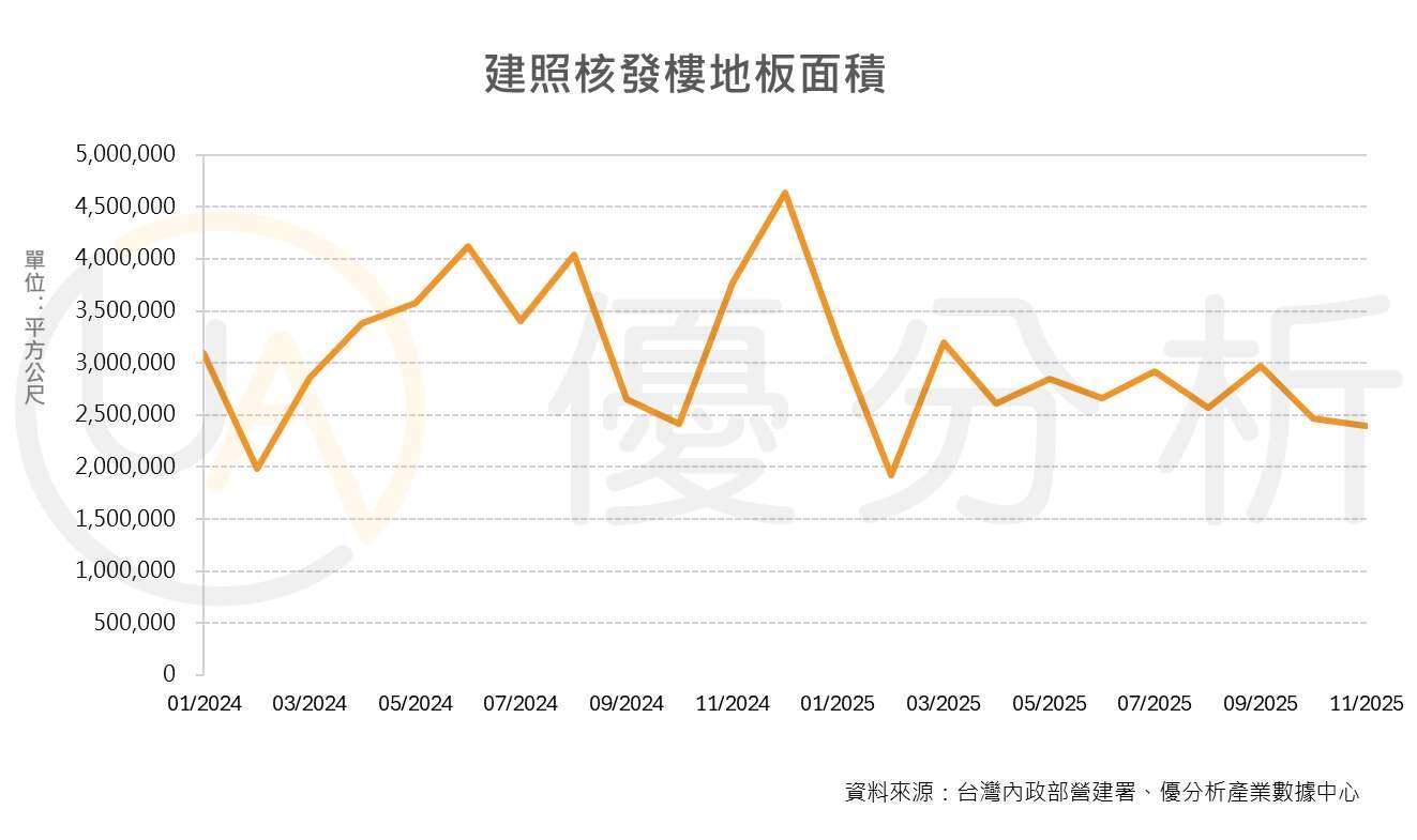 2025 年以來國內建築用鋼需求持續疲弱,1Q25 至 3Q25 鋼筋消費量年減約 5%,同期間建照核發的總樓地板面積年減幅度更達 14.4%,累計至11月的跌幅擴大至15.6%,顯示實際施工與未來動工動能同步走弱,對鋼鐵需求形成結構性壓力 。