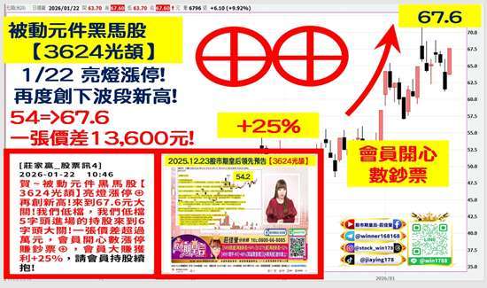 (3624-TW) 光頡,54.2 => 67.6 領先預告後大漲 +25%,受惠產品結構升級與需求回溫,2026 年整體營收有機會突破 30 億元,公司預期第一季起,薄膜電感價格將調漲約 10% 至 40%,反映供需結構轉變及成本、報價同步調整,需求面方面,光頡長期布局車用市場,近期取得車載大單,並成功通過美系 CSP 的 AI 伺服器認證,相關應用單位用量為一般伺服器的一至二倍,成為營運成長關鍵,供給端則因中國晶片電阻廠陸續減產,供給趨於收斂,有助價格回穩,法人關注毛利表現,光頡表示大股東風華高科已對部分被動元件啟動漲價,後續產能與價格動向,將持續影響市場供需格局。