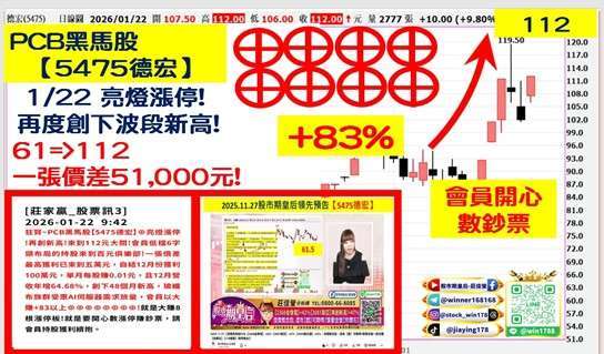 (5475-TW) 德宏,61 => 112 領先預告後大漲 +83%,近年主攻石英纖維產品,涵蓋電子級與工業級石英纖維紗及石英布,市場傳出輝達下一代 Rubin 平台將採用 M9 材料搭配 Q 布,德宏有望受惠,公司已完成試產、驗證並小量出貨,第三季轉虧為盈,隨石英布獲國際客戶認同,在 PCB 上游材料供給吃緊下,德宏後續獲利成長具想像空間,此外,德宏公布 2025 年 12 月自結財報,營收 1.13 億元,年增 64.68%,單月稅後純益達 100 萬元,EPS 0.1 元,較 2024 年同期的虧損正式轉虧為盈,隨著 AI 與高階通訊對玻纖布的需求持續增溫,德宏的獲利轉機性正吸引資金積極卡位。