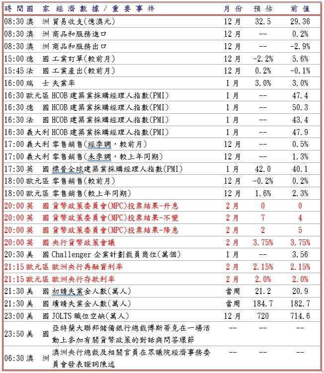 據 S&P 週三公布英國 1 月服務業 PMI 跳升至 54.0,創 2025 年 8 月以來新高,其中產出預期達到 2024 年 10 月以來最高水平,企業訂價達到 8 月以來的最高增速,這恐將影響英國央行 (BOE) 於本次會議中對未來的降息時機及降息幅度保持模糊表態,推升英鎊兌美元至 1.3733 高點。據英國國家經濟社會研究院 (NIESR) 預測,今年失業率平均恐升至 2015 年最高水平 5.4%,且超過多數預測機構的預期,令英鎊承壓,兌美元下滑至 1.3639 低點。預估今日英鎊兌美元阻力於 1.3670-1.3690,支撐於 1.3580-1.3600。