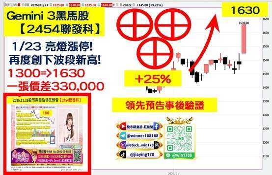 今日盤面最耀眼的明星莫過於 (2454-TW) 聯發科,1300 => 1630 領先預告後大漲 +25%,受惠於與 (NVDA-US) 輝達,深度合作切入高階 AI PC 處理器題材,市場看好其在 ASIC 客製化晶片領域的成長潛力,聯發科開盤即強勢亮燈漲停,定錨了今日 IC 設計與 AI 矽智財族群的強勢基調。