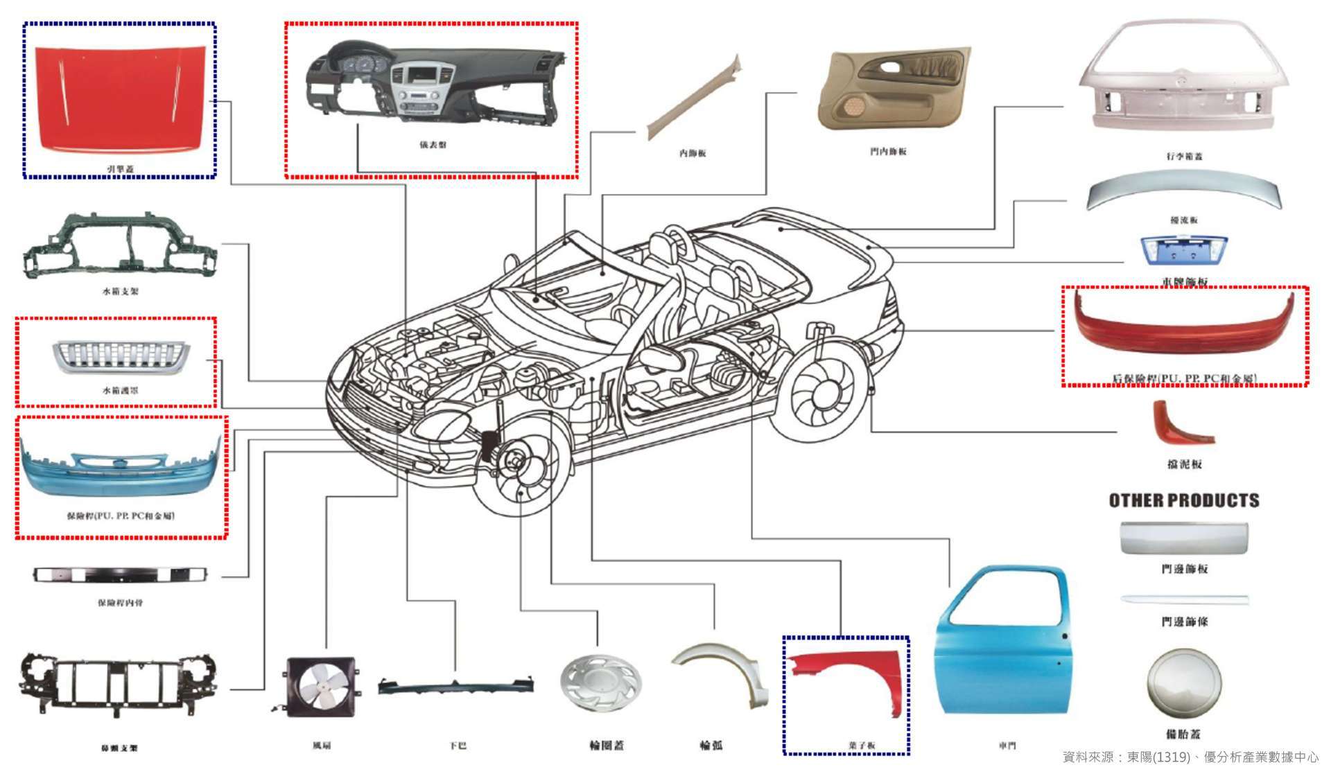 在產品結構上,東陽以保險桿、水箱護罩、引擎蓋、葉子鈑等高頻碰撞件為主,這類零組件更換頻率高、與保險理賠高度相關,是 AM 市場中最穩定的需求來源。公司累積超過 25,000 個模具與品項,可覆蓋全球約 80% 在路上行駛的車型,讓客戶能在同一供應商完成多品項採購,形成「一站購足」的供應優勢,也進一步強化其在 AM 市場的黏著度與議價能力。