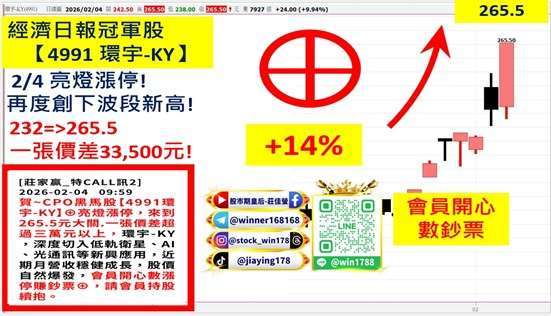受惠全球 AI 資料中心對高速光通訊需求暴增,砷化鎵晶圓代工廠 (4991-TW) 環宇 -KY,232 => 265.5 領先預告後大漲 +14%,2026 年營運動能明顯升溫,隨光收發模組進入高速成長期,加上轉投資常州承芯虧損大幅收斂,本業獲利可望出現跳躍式成長,營收與獲利有機會同步挑戰歷史高點,環宇為美系雲端服務供應商 (CSP) 高階光接收端模組核心供應商,單通道 100G 及最新 200G PD 技術領先,直接受惠 800G 光模組放量,公司亦將低毛利射頻產品逐步 EOL,全面轉向高毛利 PD 晶片,同時推進 CW Laser 與 4 吋晶圓布局,長線成長動能可期。