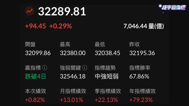 台股今 (4) 日走勢宛若坐大怒神,早盤一度面臨沈重賣壓,指數大跌超過 250 點,但隨後買盤進駐低軌衛星與面板等類股,約在上午十點指數翻紅,指數最高來到 32380 點,終場收在 32289 點,上漲 94 點,漲幅 0.29%,成交金額為 7046 億元。鉅亨贏指標專任技術分析講師 J 董分析,32000 點成為今日短線強力的心理與技術支撐位,大盤目前尚未站上贏指標的「強弱關鍵」位,年關將至需注意年前賣股需求旺盛。