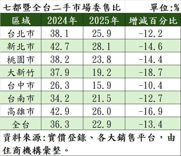 2025 年房市買氣低落,影響二手市場成交比例,住商機構統計實價登錄與各大銷售平台資料,全台 2025 年委售比僅 22.9%,象徵去年每 100 戶掛網銷售的物件,僅約 22.9 戶能順利成交,與 2024 年相比大幅下滑 13.4 個百分點。大家房屋企劃研究室公關襄理賴志昶分析,全台房價居高不下,加上銀行限貸令發酵,讓買方態度轉趨保守,導致市場去化速度顯著放緩。