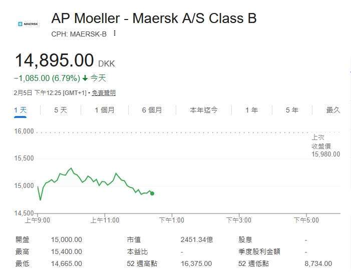 截稿前,馬士基在哥本哈根上市的股價下跌 6.79%,每股暫報 14,895.00 丹麥克朗。