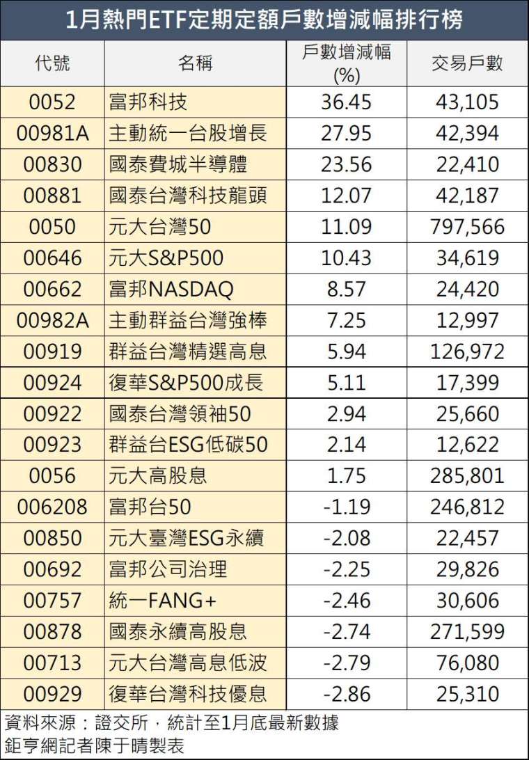 根據證交所公布熱門 ETF 前 20 名排行榜,1 月定期定額戶數增幅冠軍由富邦科技 (0052-TW) 拿下,增幅達 36%,00981A 及國泰費城半導體 (00830-TW) 分列二、三名,增幅均超過 2 成;國泰台灣科技龍頭 (00881-TW)、元大台灣 50(0050-TW)、元大 S&P500(00646-TW) 三檔 ETF 定期定額戶數也有 10% 以上的增幅。