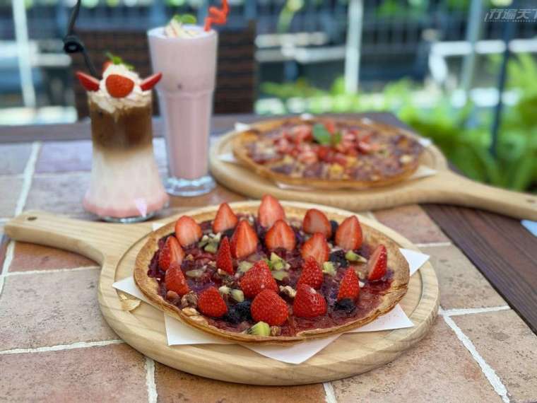 體驗了有趣豐富的食農教育認識草莓,不妨也順遊品嘗一下特別的草莓料理吧!栽種草莓近 40 年的觀光果園的「莓圃休閒農園」,園主林良敬堅持以友善農法與產銷履歷栽種,讓孩子安心體驗採果樂趣。每年 12 月至 5 月草莓季期間,除了可以採摘一般的紅草莓、珍貴的白草莓,還能品嘗季節限定的草莓披薩、草莓紫蘇焦糖雞腿排等創意料理,雙人披薩下午茶好吃好看,拍照格外夢幻。
