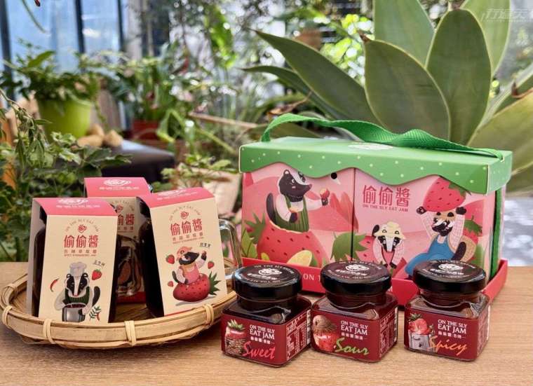 由於園區生態豐富,夜裡常有果子狸悄悄試吃熟成草莓,成為農園「安全無毒」最自然的背書。秉持「以莓好,圃出酸甜浪漫」的理念,林良敬夫妻用心研發出告辣、香甜與酸溜草莓醬三種風味的「偷偷醬」,以自種無毒草莓與水果混搭,每瓶含有高達 80%新鮮草莓,再搭配洛神、楊桃、金桔、檸檬與馬告胡椒等,慢火熬煮約 120 分鐘,不添加防腐劑、香精和色素,自然健康清爽不膩,加上可愛的果子狸圖案包裝,讓人一打開就感受到滿滿莓好心意。