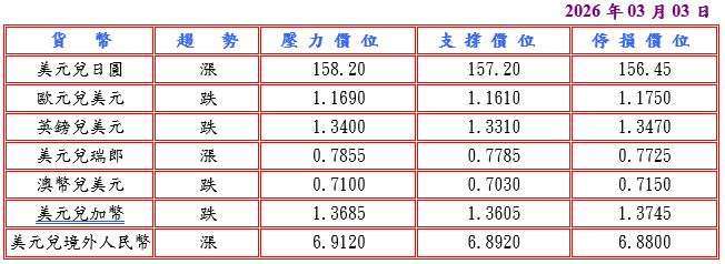 隨著美國總統川普提名前美國聯邦準備理事會 (FED) 理事沃什作為現任主席鮑威爾繼任者,尚未提交參議院啟動正式確認程序文件,增添相關進程的不確定性,但 S&P 全球公布美國 2 月製造業 PMI 終值升至 51.6,而且美國供應管理協會 (ISM) 數據顯示 1 月製造業 PMI 為 52.4 優於預期,更連續第二個月高於 50.0 榮枯分水嶺,衡量工廠投入品價格的指標更升至近三年半以來最高,突顯出在加徵進口關稅下國內通貨膨脹存在上行風險,推升美元兌日圓至 157.75 高點。預估今日美元兌日圓支撐於 157.00-20,阻力於 158.20-40。