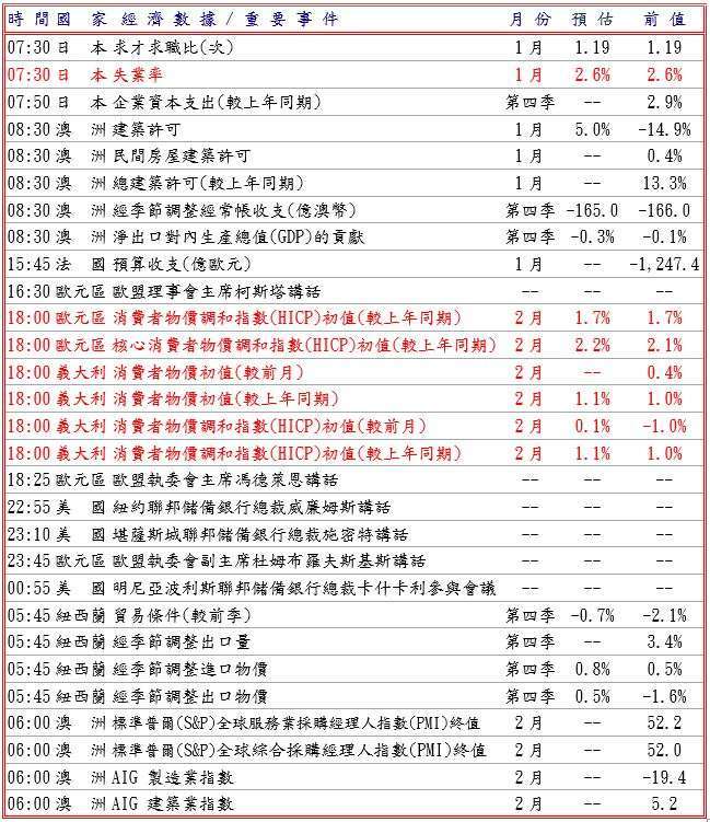 據 S&P 全球編制 2 月 HCOB 製造業 PMI 終值調查,法國與德國分別升至 50.1 及 50.9,歐元區亦回升至 2020 年 6 月以來最高 50.8,但德國 1 月實質零售銷售較前月降 0.9% 超過預期,並據歐洲央行 (ECB) 管理委員會委員科赫稱,若歐元區經濟因不確定性再度加劇而面臨潛在威脅,ECB 應做好準備在必要時將關鍵利率向任一方向調整,重創歐元兌美元至 1.1671 低點。預估今日歐元兌美元阻力於 1.1690-1.1710,支撐於 1.1600-20。