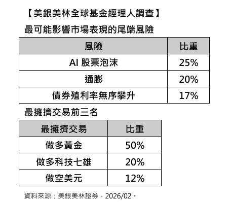 以上資料依據彭博資訊,2 月份美銀美林經理人調查於 2/6~2/12 進行,對管理 4,400 億美元資產的 162 位經理人進行調查。