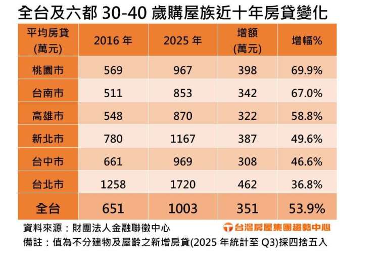 購屋壓力山大,根據房仲業者統計金融聯徵中心新增房貸資料顯示,30-40 歲購屋主力客群,2025 年前三季平均房貸金額已攀升至 1003 萬元,正式跨入千萬房貸時代,且相較十年前足足增加逾 350 萬元。