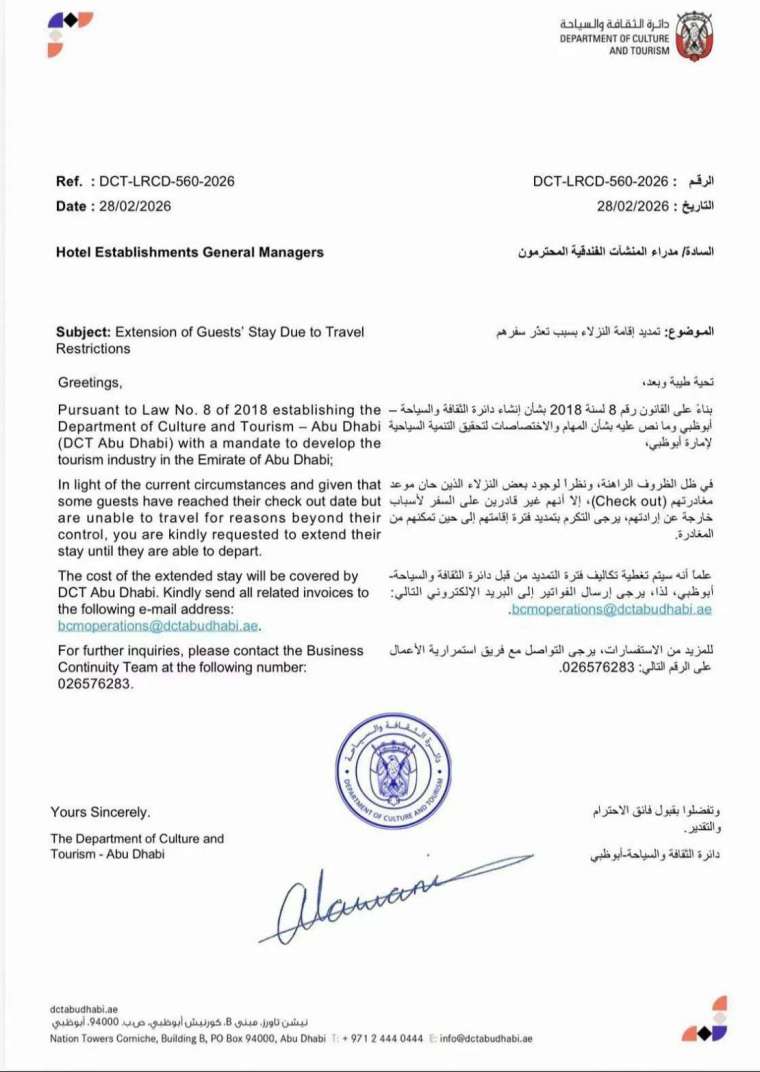 根據阿布達比文旅局 (DCT Abu Dhabi) 發布的通知,因不可抗力無法離境的旅客,酒店必須為其延長住宿,費用由文旅局承擔。據陸媒報導,滯留當地的中國遊客表示,僅需將航空公司取消航班的郵件轉發給酒店,即可成功辦理免費續住,部分酒店甚至提供免費三餐及洗衣服務。