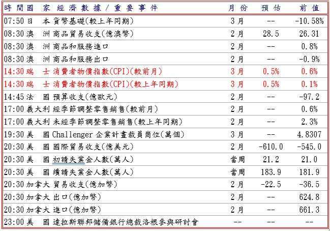 週三 S&P 全球公布英國 3 月製造業 PMI 終值降至 51.0,產出分項指數則降至 49.2,為 9 月以來首次收縮,但製造業成本較前月漲幅創 1992 年以來最大,扶助英鎊兌美元守住 1.3217 低點。隨後英國央行 (BOE) 表示,伊朗戰爭加劇金融穩定性風險,而且 BOE 總裁貝利認為市場仍操之過急,提前將 BOE 為應對伊朗戰爭對經濟造成衝擊而加息的預期反應在市場價格上,但市場寄望伊朗戰爭接近尾聲而軋平部分美元多頭頭寸,推動英鎊兌美元漲至 1.3346 高點。預估今日英鎊兌美元支撐於 1.3240-60,阻力於 1.3350-70。
