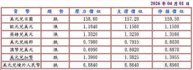 據消息人士透露,因伊朗戰爭推高通貨膨脹,德國主要經濟智庫下調今年經濟增長預期一半至 0.6%,但油氣價格飆升影響歐元區 3 月消費者物價調和指數 (HICP) 突破歐洲央行 (ECB) 目標達 2.5%,而且 ECB 管理委員會委員米勒不能排除 4 月加息的可能,提振歐元兌美元至 1.1563 高點。預估今日歐元兌美元支撐於 1.1540-60,阻力於 1.1640-60。