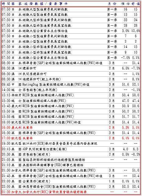 昨日澳洲央行 (RBA) 發布 3 月會議紀錄顯示,政策委員會對加息存在分歧,未來利率路徑仍不確定,並據澳盛銀行 (ANZ) 調查紐西蘭 3 月企業展望與活動指數分別降至 32.5 及 39.3,但中國 3 月官方製造業與非製造業 PMI 重返擴張區間達 50.4 及 50.1,分別創一年及三個月高點,而且華爾街日報報導,美國總統川普願意在霍爾木茲海峽仍封閉下結束戰爭,改善風險情緒,支撐澳幣和紐元等風險貨幣,歐元兌美元則穩守 1.1446 低點。