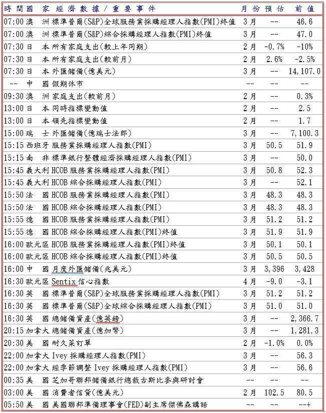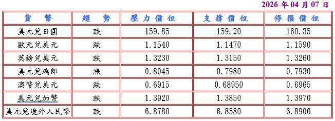 伊朗戰事依然激烈,據報導稱兩架美國戰鬥機被伊朗擊落,令中東緊張局勢在復活節假期長周末持續升溫,而且美國總統川普威脅伊朗重啟對全球能源供應至關重要的荷姆茲海峽最後通牒至美國東部時間 4 月 7 日晚間 8 時,否則將升級對其的打擊,提升美元的避險需求,昨日令澳幣和紐元等風險貨幣承壓,歐元兌美元則下探至 1.1504 低點價位。