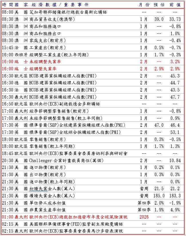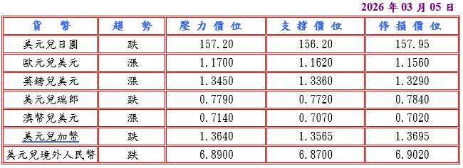 據克利夫蘭聯邦儲備銀行總裁哈瑪克稱,目前判斷伊朗戰爭的影響為時過早,支持在一段時間內維持利率不變,而且美國 ADP 全國就業報告顯示 2 月民間就業崗位增加 6.3 萬個超過預期,但 1 月數據大幅下修後僅增加 1.1 萬個,並據美國供應管理協會 (ISM) 公布 2 月非製造業 PMI 創 2022 年 7 月以來新高 56.1,但中東戰爭給此美好前景蒙上陰影,而且美國聯邦準備理事會 (FED) 理事米蘭認為伊朗衝突不應成為延遲降息的理由,衝擊美元兌日圓回落至 156.84 低點。預估今日美元兌日圓阻力於 157.00-20,支撐於 155.80-156.00。