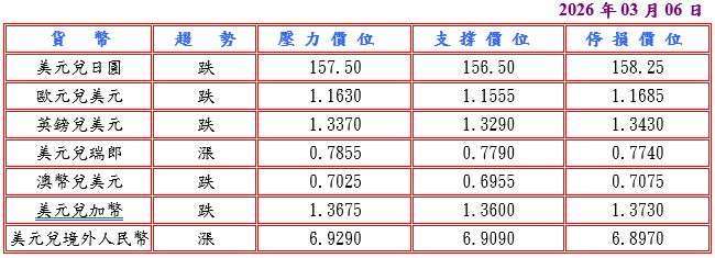 隨著伊朗向以色列發射多輪導彈,迫使數百萬居民湧進防空洞避難,持續六天的美國和以色列對伊朗的戰爭仍主導市場,並據美國公布截至 2 月 28 日當周,經季節調整初請失業金人數持平 21.3 萬人低於預期,同時 1 月進口與出口物價分別較前月升 0.2% 及 0.6% 高於前值,第四季非農生產率環比年率增幅則放緩至 2.8% 仍優於預估值,而且里奇蒙聯邦儲備銀行總裁巴爾金稱,當前中東戰爭可能進一步推高關鍵消費價格之際,持續高企的通貨膨脹和近期強勁就業數據或將改變 FED 風險展望,提振美元兌日圓至 157.85 高點。今日市場焦點在美國就業報告,預估美元兌日圓阻力於 157.50-70,支撐於 156.30-50。