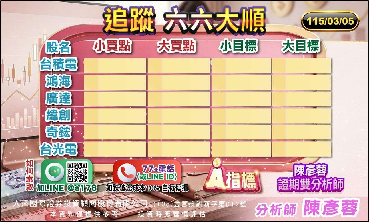 大來投顧陳彥蓉表示,美股受惠 2 月小非農優於預期,顯示勞動市場穩健,降息機率續增,有再帶動美股反攻機會;台股受惠 AI 資本支出擴大,供應鏈營運爆發、題材不斷,亦有再領盤勢創高機會。元宵變盤先提醒,下跌急殺價值現,地緣政治飆股超跌機會,青雲第 2 目標翻倍 LINE 留 777+1 索取翻倍飆股。