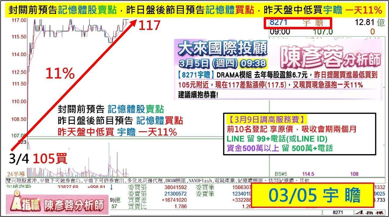 賀本欄與 YT 頻道與 LINE 粉絲團,一年前預告 南亞科 (2408-TW),德宏(5475-TW) 大飆六倍,三個月前預告 旺宏 (2337-TW) 方土昶(6265-TW) 大飆兩倍,穎崴(6515-TW) 大飆 2,500 萬翻倍,上週預告鑫聯大 (3709-TW) 三支漲停,本週三早上九點前預告邁科(6831-TW),大盤大跌 2,500 點,邁科兩天 16%, 好友如想領先於當天早上九點前知道誰有機會當天連續長紅漲停? 1-2 個月後資金翻倍 100%? 歡迎點下面連接 加 LINE 留言 777+1 可領先得到提醒。