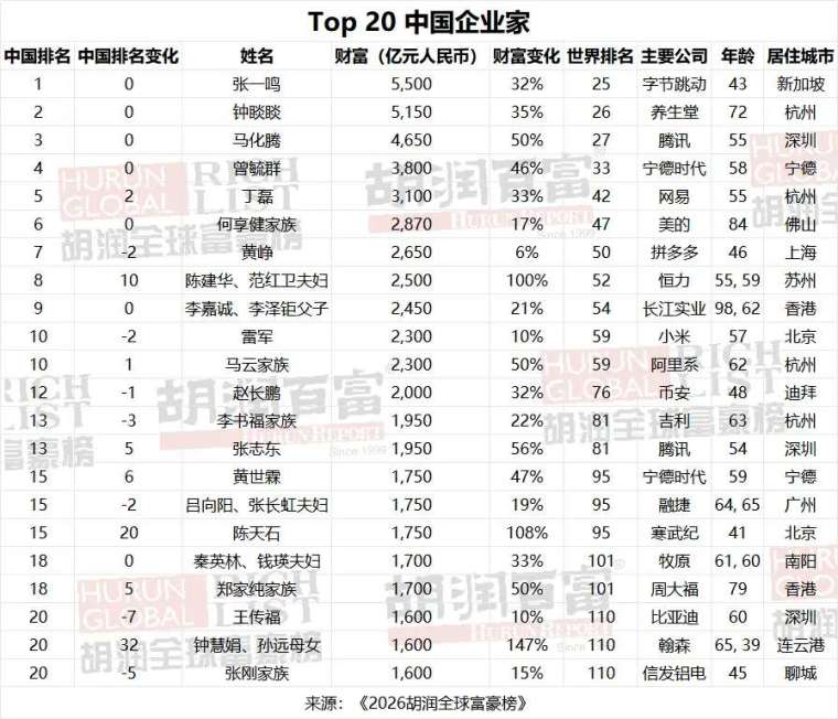 胡潤研究院周四 (5 日) 發布《2026 胡潤全球富豪榜》,這也是該研究院連續第 15 年發布此項榜單。報告顯示,全球財富格局在過去一年發生劇烈變動,全球 10 億美元企業家人數首次突破 4000 大關,達到 4020 位,較去年大幅增長 17%,總財富也隨之增長 28%。