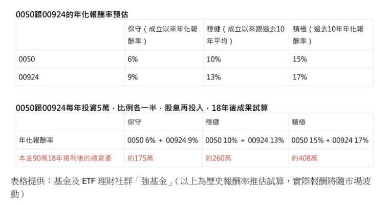 基金及 ETF 投資社群「強基金」長期追蹤 0050 與 00924 的報酬表現,並以每年固定投入 5 萬元、持續 18 年為前提,建立長期複利推估模型。由於 0050 與 00924 成立時間尚未完整涵蓋多次市場循環,王大中參考成立逾 25 年的 EWT(iShares MSCI Taiwan ETF)與 IVW(iShares S&P 500 Growth ETF)作為績效基準,分別對應台股與美股成長型產業表現。並以「成立以來」及「近 10 年」年化報酬率區間,建立保守、穩健與積極三種情境假設。