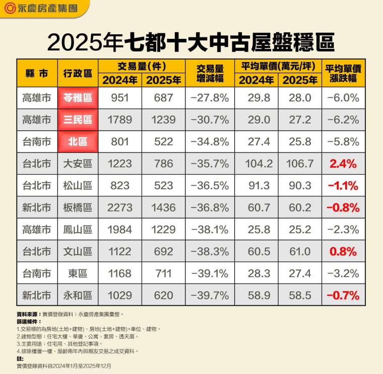 在台灣央行信用管制持續影響下,近一年房市交易量普遍出現下滑,但市場上仍有交易衝擊相對小的區域。永慶房產集團統計七都各行政區近一年中古屋交易量增減幅,數據顯示,交易量量縮幅度最少前三名由高雄和台南包辦,其中高雄苓雅區位居第一,交易量縮減不到 3 成,成全台交易量減幅最小行政區。