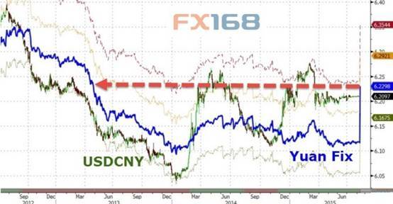 如下圖所示,人民幣中間價調降1136個基點或1.8%,報6.2298元,調降幅度為有史以來最大,上日中間價報6.1162。中間價今日調降至2013年4月25日以來最弱。同時,央行表示,今日人民幣兌美元中間價報價在上日收盤匯率6.2097元的基礎上出現約200個基點的貶值。