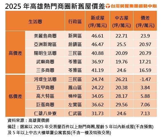 台灣房屋集團趨勢中心經理李家妮表示,高大特區為新興重劃區,交易主力以輕屋齡產品為主,五甲及河堤商圈,則是新案供給少,多以中古屋為主力,這類商圈產品主力屋齡相近、差異化低,平均價差相對也會縮小。同時,五大低價差商圈,皆屬於機能完善的熱門生活圈,中古屋市場流通量大、抗跌性強,加上部分屋齡較新的中古大樓仍具競爭力,使中古價格與新案差距較為有限。