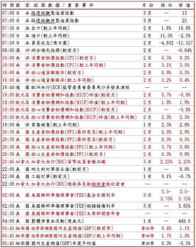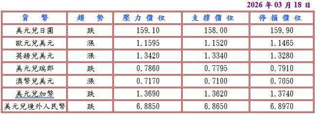 據全美房地產經紀人協會 (NAR) 數據顯示,美國抵押貸款利率回落,推動 2 月成屋待完成銷售指數反彈至 72.1 優於預期,但美國國家經濟委員會哈西特表示油輪開始零星通過荷姆茲海峽,並重申總統川普政府認為伊朗戰爭僅會持續數周而非數月的立場,而且川普稱在不久將來撤出伊朗行動,打壓美元兌日圓至 158.70 低點。今日市場聚焦美國聯邦公開市場委員會 (FOMC) 貨幣政策會議決議,普遍預期維持利率不變,但伊朗戰爭導致全球五分之一石油供應滯留,可能擾亂經濟增長,關注美國聯邦準備理事會 (FED) 政策制定者是否採取謹慎甚至鷹派立場。預估今日美元兌日圓阻力於 159.10-30,支撐於 157.80-158.00。