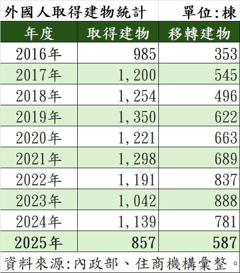 政府打炒房連續七波措施劍指高總價房產市場,也令外國人購置房產意願直線下滑。房仲業者統計內政部資料,2025 年外國人取得建物僅 857 棟,成交件數為 2005 年以來的 20 年最低。