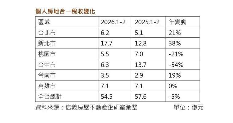 根據財政部統計資料庫數據顯示,今年前兩個月的個人房地合一稅收為 54.5 億元,年減幅度達 5%,與前兩月的建物買賣移轉棟數減幅相近,不過區域稅收狀況卻出現明顯差距,雙北市前兩月的個人房地合一稅收成長幅度都超過兩成,反觀去年前兩月繳稅王的台中市,個人房地合一稅收則年減幅度達 54%。