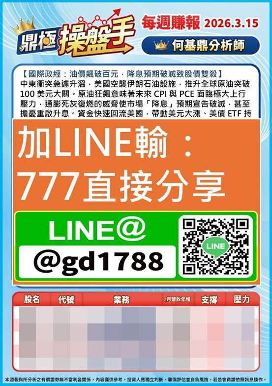 在操作紀律上,務必嚴守「低買高賣」原則。切忌在恐慌急跌時殺低,也不要在報復性反彈時盲目追高。現階段應嚴格控管資金水位,避免過度使用融資槓桿,並保留充沛現金;建議耐心等待大盤回測季線附近的低接佈局機會,才能在亂流中持盈保泰,個股的部分,下周有輝達 GTC 大會還有美光財報公佈,相關類股旺宏、威剛、光聖、創威等都值得大家留意,詳細有哪些股票,可以加 LINE 索取,本周最新周報!