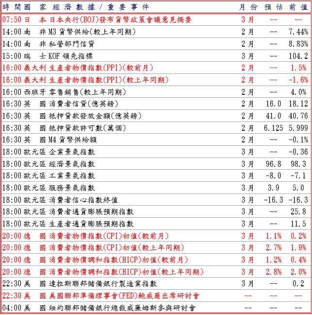 美國勞動力市場穩定,可能為美國聯邦準備理事會 (FED) 維持利率不變提供空間,而且華爾街日報報導,五角大樓考慮向中東地區增派一萬名地面部隊,削弱市場對戰爭近期將結束的期望而尋求避險,上週五推動美元走高,但美國總統川普稱與伊朗談判進展良好,暫停對伊朗能源設施襲擊十天,緩和美元漲勢;此外,日本財務大臣片山皋月警告受原油市場走勢驅動的投機行為,政府準備在外匯市場採取果斷措施,口頭干預引發美元兌日圓下滑,並據前日本央行 (BOJ) 理事門間一夫指出,BOJ 很可能在下個月的季度報告中警告中東衝突導致需求萎縮衝擊經濟,但通貨膨脹壓力加劇,可能等到最後一刻才決定利率政策,而且 BOJ 上調自然利率估算約在負 0.9% 至正 0.5% 區間,推低美元兌日圓至 159.43 低點。