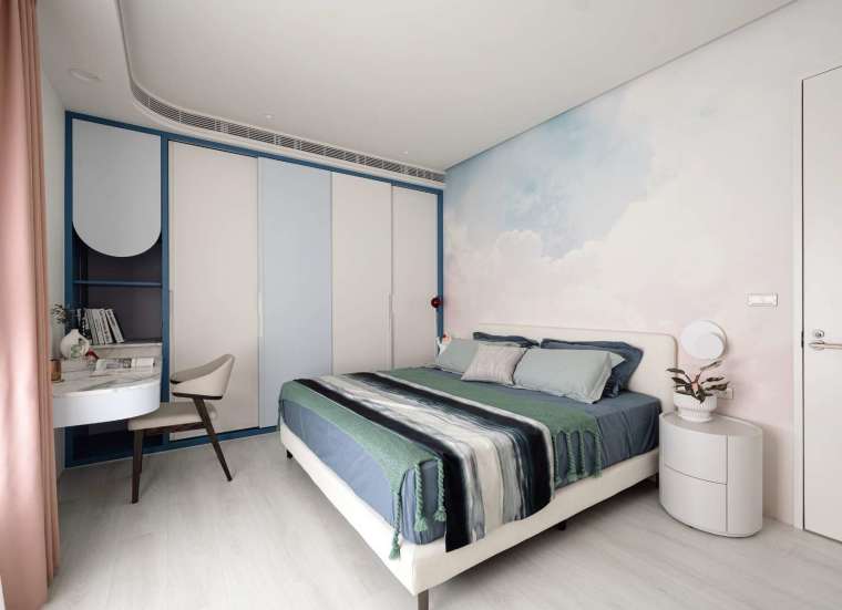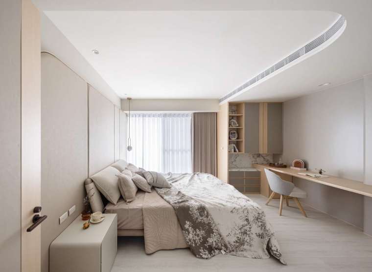主臥室則延續整體環境的安定感,利用布質包覆的床頭背板與柔和曲線,建構出一方足以卸下疲累的舒眠角落。設計師並特別在主臥室內側打造一處隱密的小書房,為男主人預留簡約且能專注自處的私密空間。從公領域到私領域,每一寸設計都兼顧了彈性與獨立性,為家庭生活留下了最從容的餘裕。