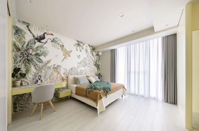 私領域的規劃則回歸到每位家庭成員的獨特特質。兒童房的規劃充滿參與感,由兩位國小年紀的孩子親自挑選心儀的壁紙風格:一間以綠意盎然的叢林為主題,另一間則呈現天空與月光交織出的柔藍氣息。房內配置可隨意調整角度的圓形壁燈,投射出的光暈宛如月相盈虧,為孩子打造出充滿想像力的溫柔角落。
