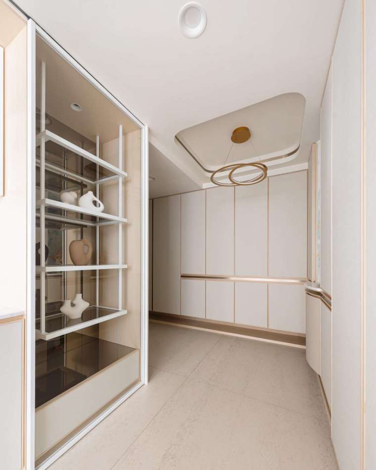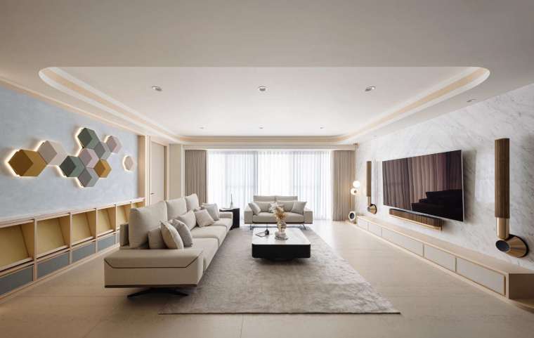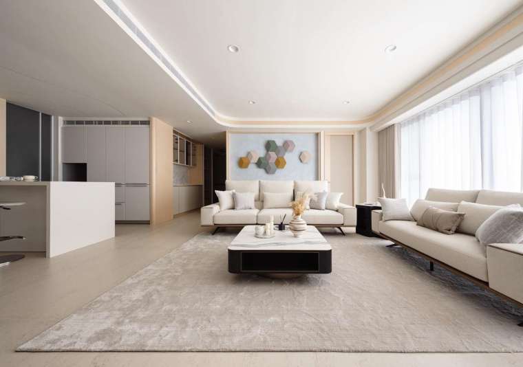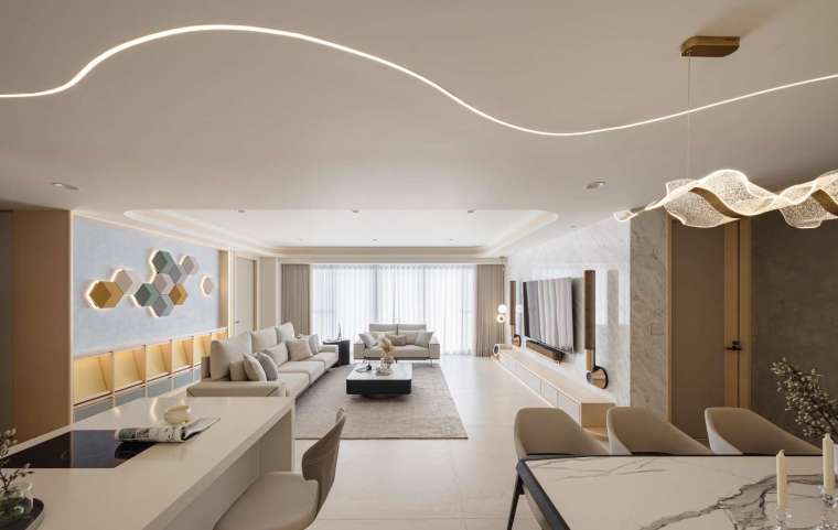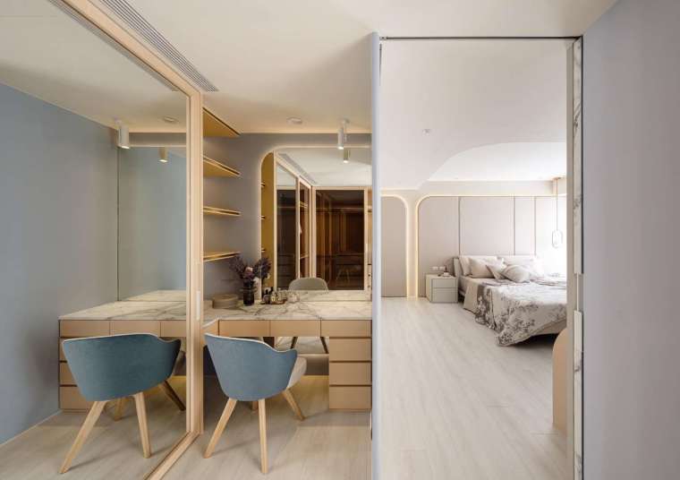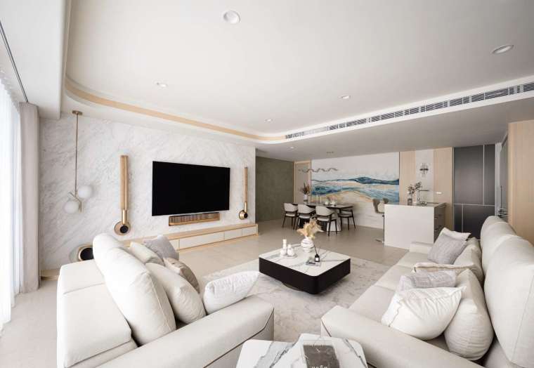 本案面積約 70 餘坪,原本為半毛胚狀態,由此給予設計師重新定義生活的契機。為了與窗外壯麗的海港景色接軌,整體環境以極淡木質色鋪陳,並利用流動曲線與輕盈光帶,使內部空間成為戶外時間變換的倒影。步入公領域,腳下鋪設的是 120×120 大尺幅石紋磚,氣勢十足且減少接縫的視覺干擾,讓自然光能在地面無礙地漫流,進而提升住家的開闊感受。
