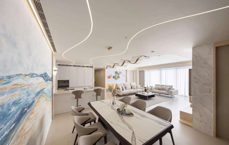 天花處理是全室設計重頭戲,設計師運用彷彿海面風軌的大曲線,從玄關優雅地延伸至餐廳與中島區域。這道如柔波凝住的優美弧線,巧妙化解了吊隱設備壓梁帶來的沉重感,也串聯起一家四口日常活動的動態軸線。牆面則混搭著環保塗料、柔適布面與手工塗繪,在不同時段的光線照射下,展現出極為細膩的動態質感。淡色木皮刻意降低紋理辨識度,僅保留木頭原本的溫潤觸感,再適度搭配大理石,為公共場域堆疊出高雅的美學底蘊。