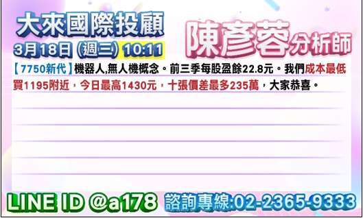 大來投顧陳彥蓉表示,美股續受 GTC 聚焦 AI 新設計,聯準會利率公布在即,資金回籠後有再攻新高機會;台股 AI 供應鏈大受其惠,漲價題材、產業成長循環續攻,將領盤勢再攻千點機會。惟短線油價上漲,限制反彈幅度,權值守穩不追高,下檔精選倍數股,方土昶第 2 目標 200% LINE 留 777+1 索取。