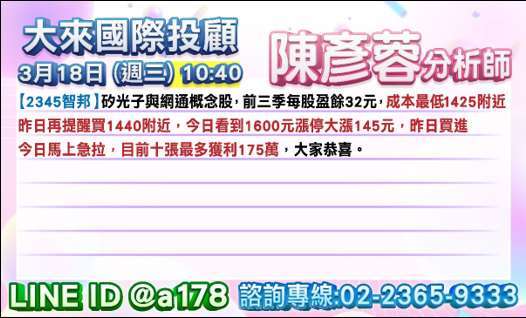 本欄與 YT 頻道與 LINE 粉絲團,預告股票經常快速長紅翻倍。昨天 18 日預告預告 智邦 (2345-TW) 榮科(4989-TW) 晶呈(4768-TW) 今日全漲停! 好友如想領先於當天早上九點前知道誰有機會當天連續長紅漲停? 1-2 個月後資金翻倍 100%? 歡迎點下面連接 加 LINE 留言 777+1 可領先得到提醒。