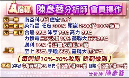 彥蓉真績效作節目,大盤拉回我們常逆勢獲利,大盤上漲帶會員經常超越大盤漲幅有預告證明,買起漲,不射飛鏢帶,買股,經常馬上發動,經常每週提供 10%-30% 以上收割。每檔一個月常有 30% 以上幅度,三個月左右翻倍。歡迎見證!