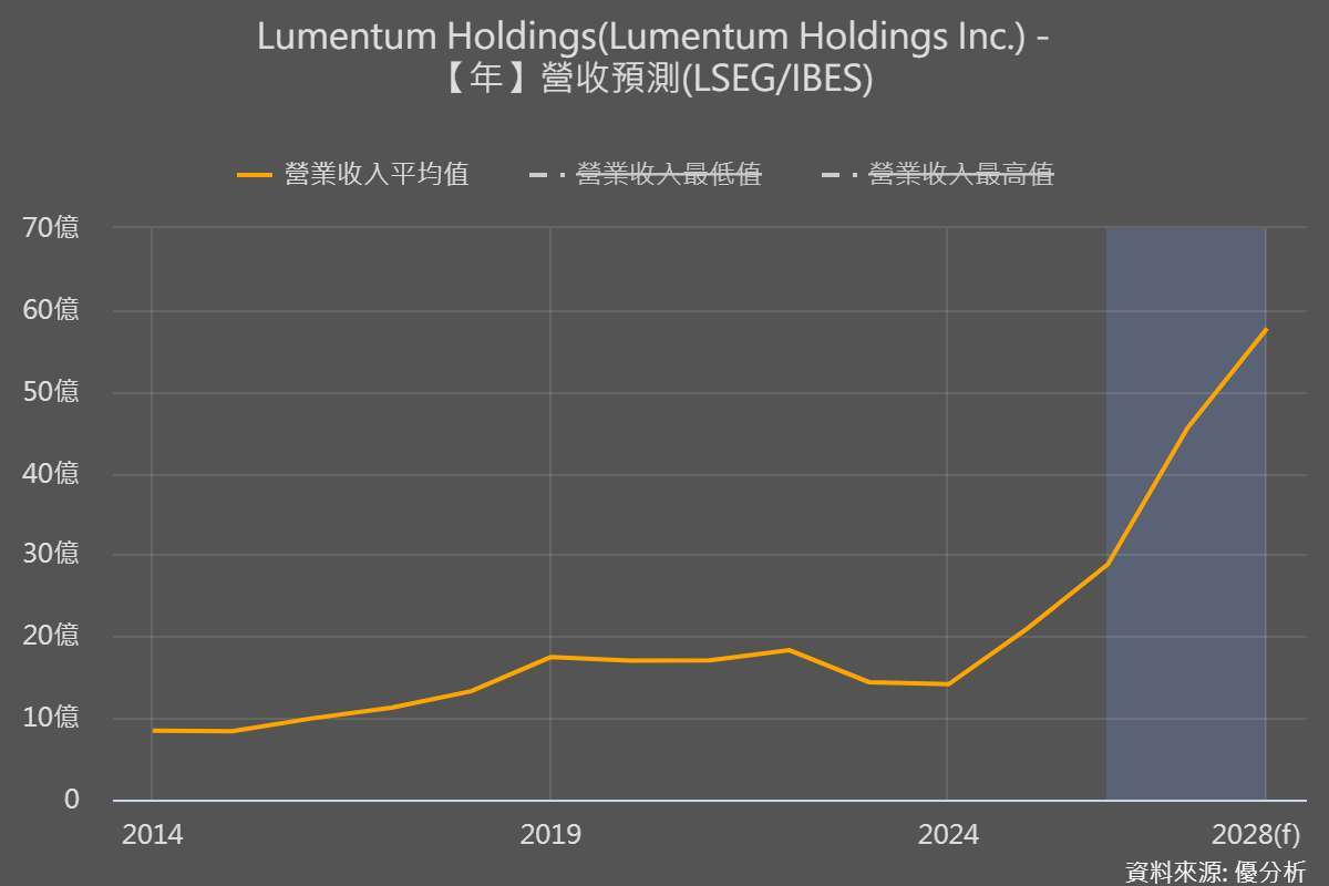 但若將兩家龍頭——Lumentum Holdings(LITE-US) 與Coherent Corp(COHR-US)的中期營收軌跡放在同一張時間軸上觀察,會發現一個不太符合傳統框架的現象:兩者的營收轉折點,幾乎同步落在2026年前後。這種「同步爆發」並非巧合,而更像是產業結構轉折的訊號。