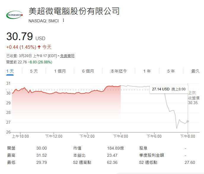 截稿前,美超微 (SMCI-US) 周五盤前股價下跌 26.08%,每股暫報 22.76 美元,市值報 184.89 億美元。