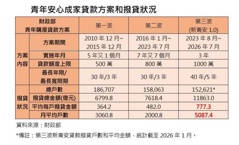 觀察財政部推動青年安心成家貸款方案從 2010 年起已經有三波,方案名稱相同,但內容與時俱進,額度最早僅 500 萬元,最長 30 年期,寬限期三年;2016 年額度提高至 800 萬元,其餘條件相同;直到 2023 年額度再提高到 1000 萬元,最長年期更長達 40 年,寬限期上限也加長到 5 年,掀起申請熱潮,累計至 2026 年 1 月,撥貸總金額達 1 兆 1863 億元,已有 15 萬 2621 戶撥貸,