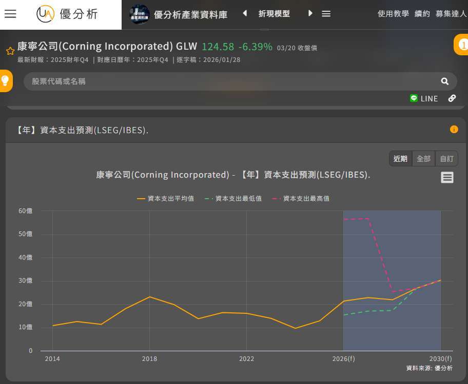 從優分析產業資料庫的IBES功能可以看到,法人也預估康寧再接下來資本支出將會來到歷史高點的水位。