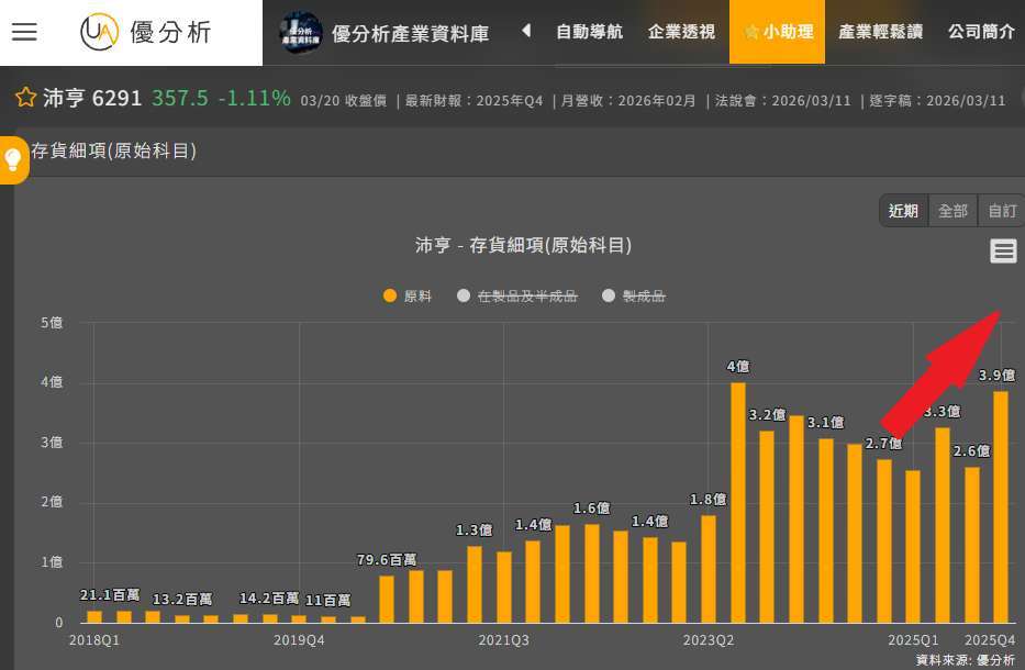 從公司的存貨也可以看到類似的訊號。2025 年下半年開始,原料明顯增加,代表公司已經提前備料,準備因應後續需求。