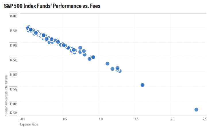 由於這些基金的投資組合幾乎相同,費用最低的產品幾乎總是能帶來最佳的績效表現。下圖清楚顯示,基金的費用率(expense ratio)與其績效之間存在明顯的關聯性。