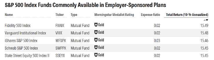 以下為雇主提供之退休計畫中,常見且表現優異的標普 500 指數基金。